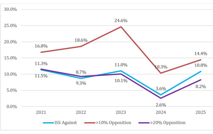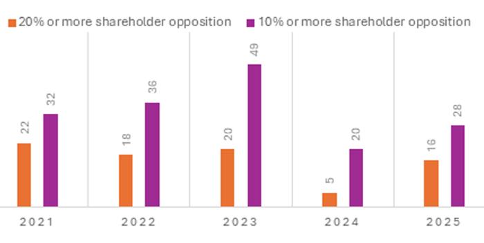 The number of resolutions with over 20% opposition so far in 2025 has been three times the count during the same period in 2024.